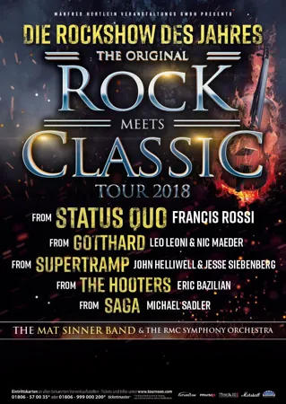 Die Erfolgsgeschichte geht weiter! Nach acht erfolgreichen Jahren, über 500.000 begeister-ten Besuchern in fünf Ländern und internationalen Top-Künstlern wie Ian Gillan (Deep Pur-ple), Alice Cooper, Don Felder (Eagles), Steve Lukather (Toto), Joey Tempest (Europe) oder Midge Ure (Ultravox) geht Rock meets Classic 2018 in eine weitere Runde! Am 15. April 2018 gastiert erneut die Creme de la Creme der Rockmusik in der Münchner Olympiahalle. Dieses Mal mit dabei: von STATUS QUO: Francis Rossi, von GOTTHARD: Leo Leoni & Nic Maeder, von SUPERTRAMP: John Helliwell & Jesse Siebenberg, von THE HOOTERS: Eric Bazilian, von SAGA: Michael Sadler & The Mat Sinner Band with the RMC Symphonie Or-chestra.